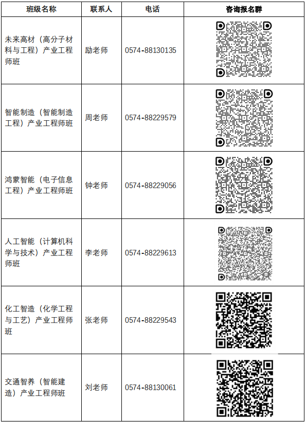 1.咨询及报名:有兴趣报名产业工程师班的同学,可钉钉扫码入群进行咨询,届时报名参加选拔,各产业工程师班咨询报名群具体信息如下: